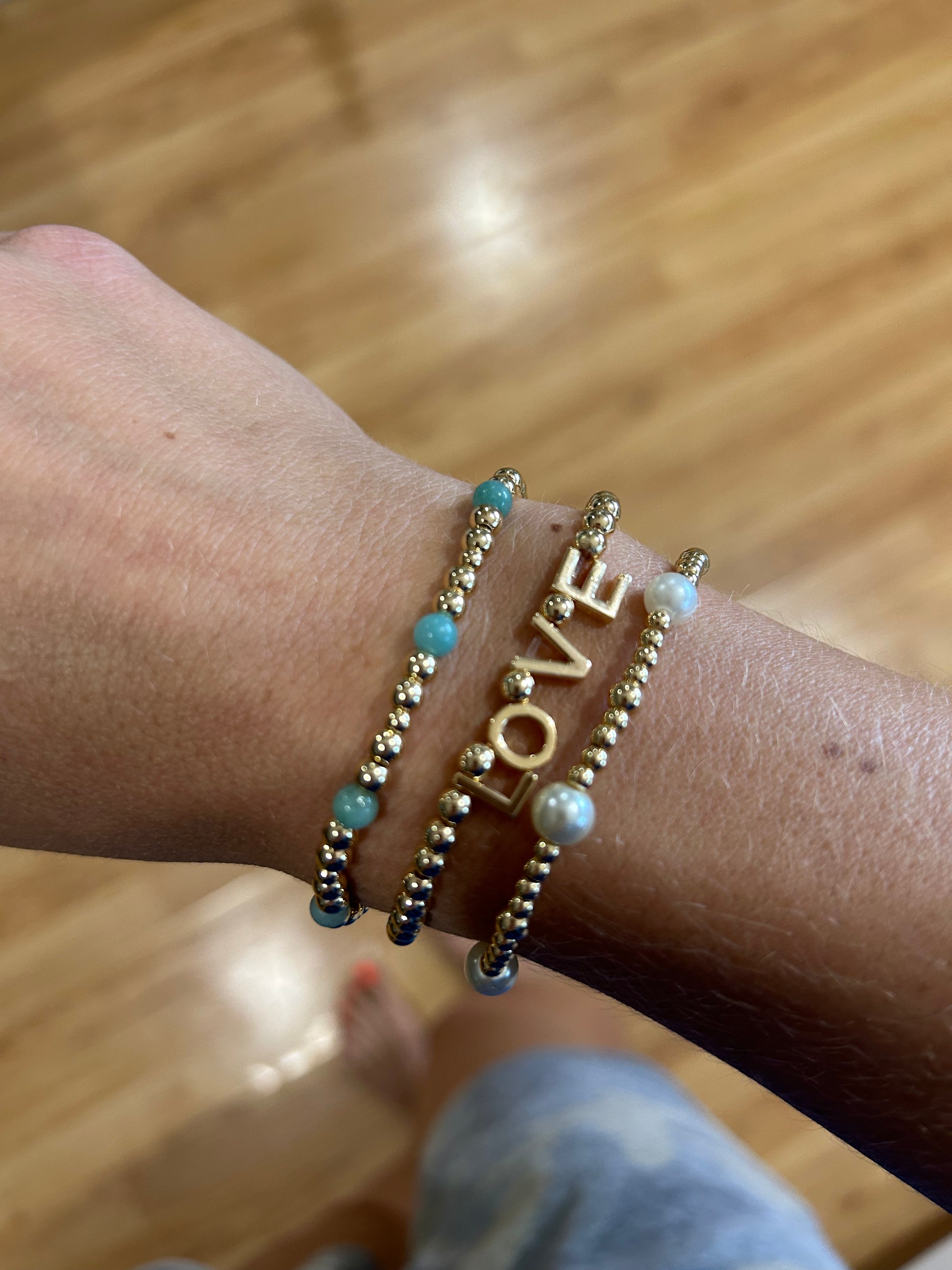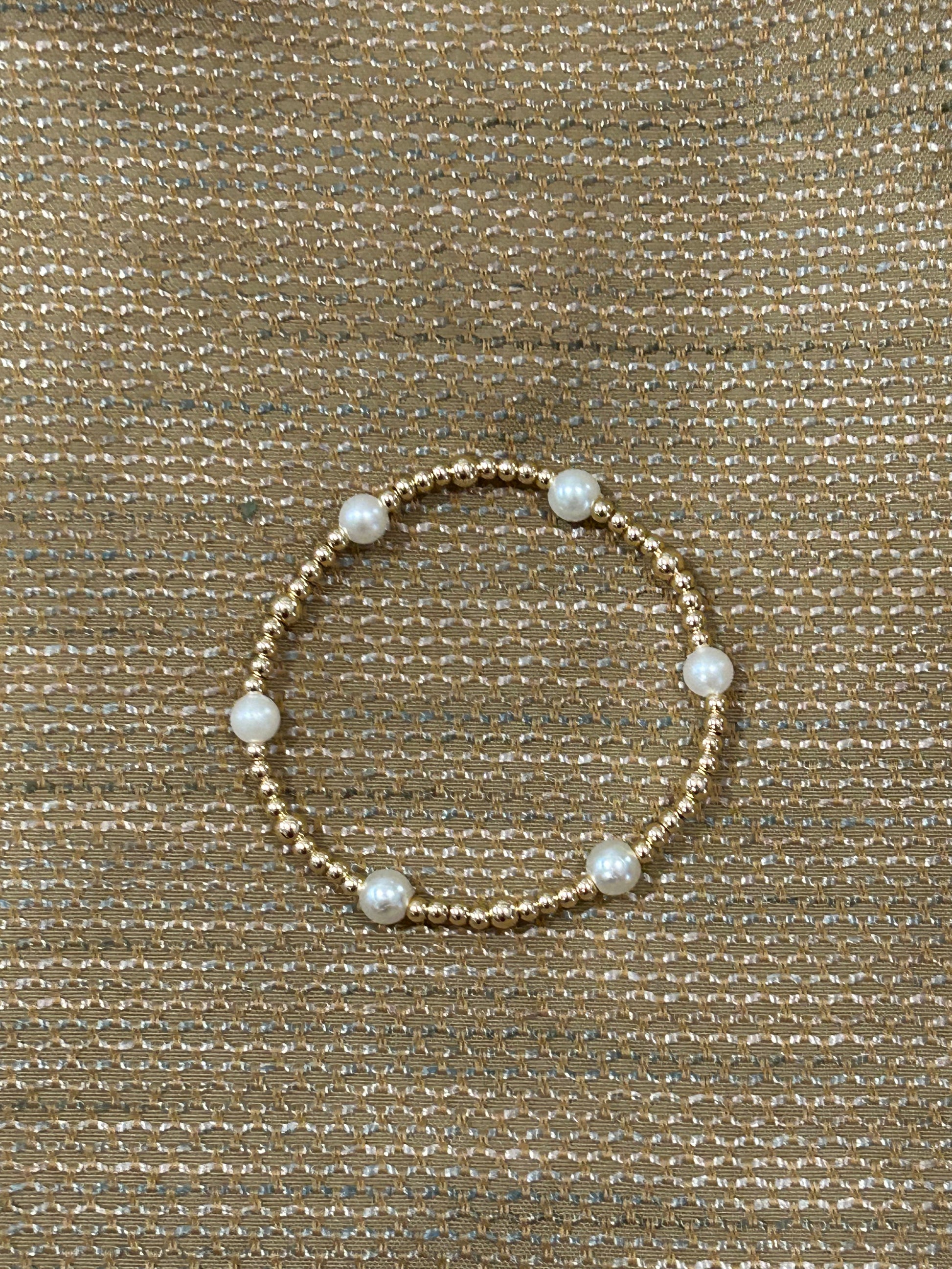 This adorable gold bracelet is perfect to dress up or down for your any day wear. 8mm pearls, 4mm and 3 mm gold beads.