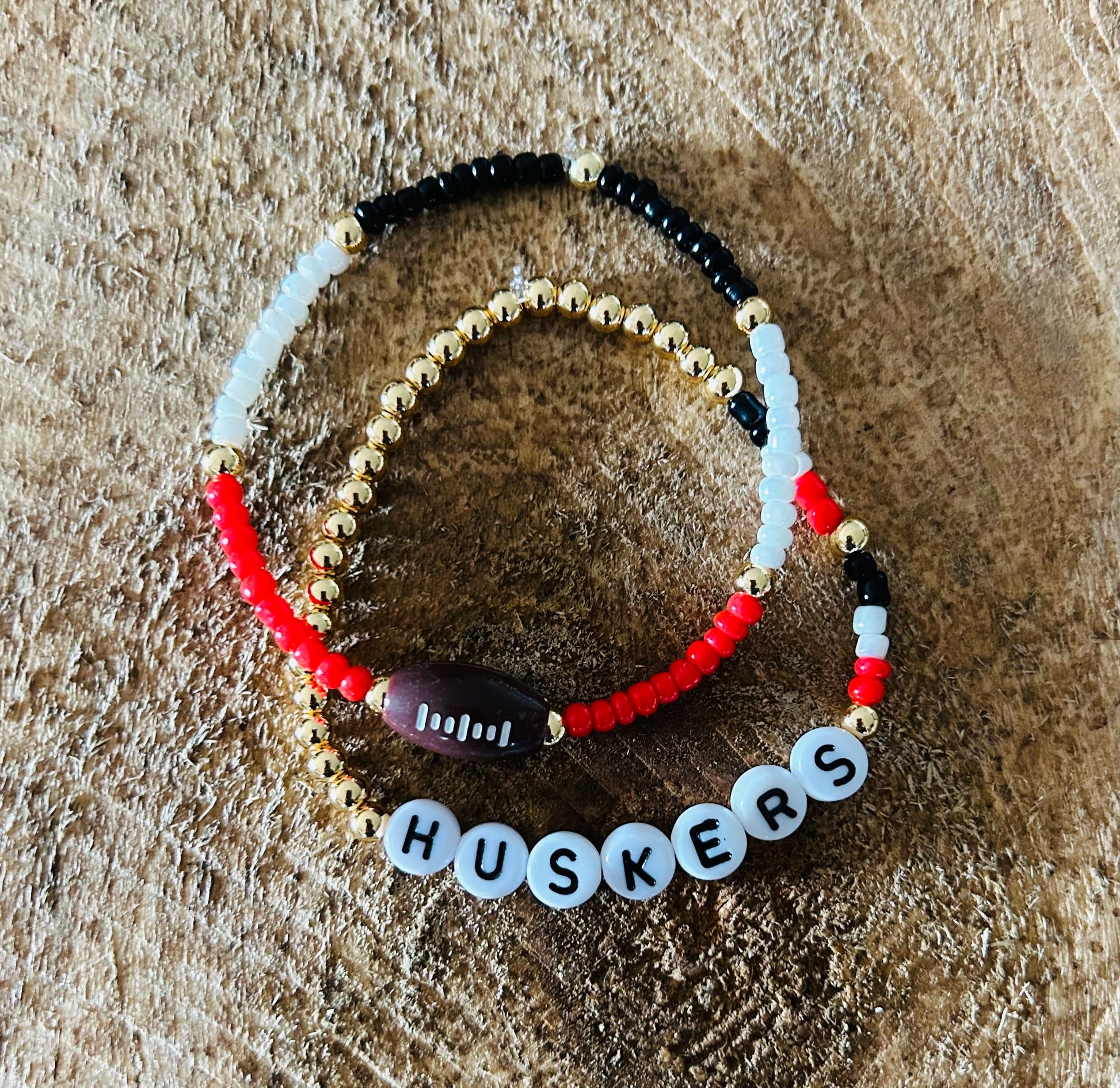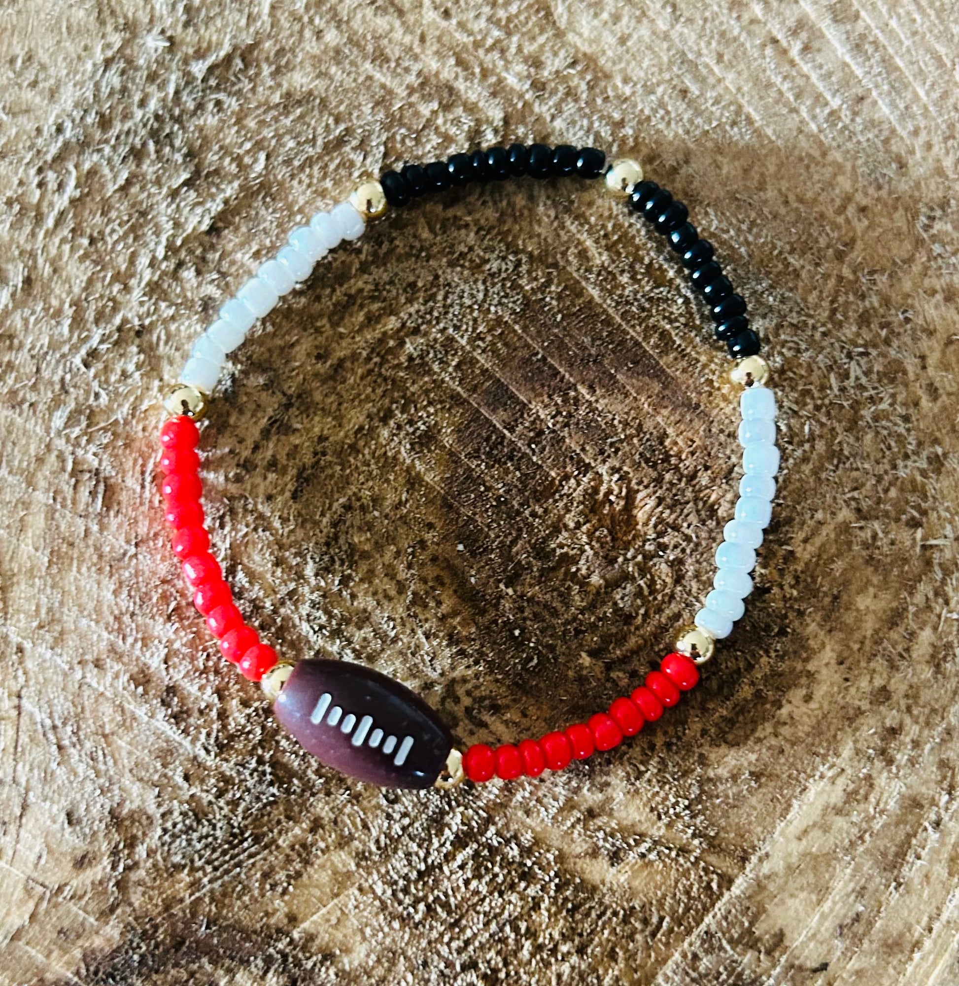This adorable gold and glass beaded bracelet is perfect to dress up or down for your any day wear or to a football game!
