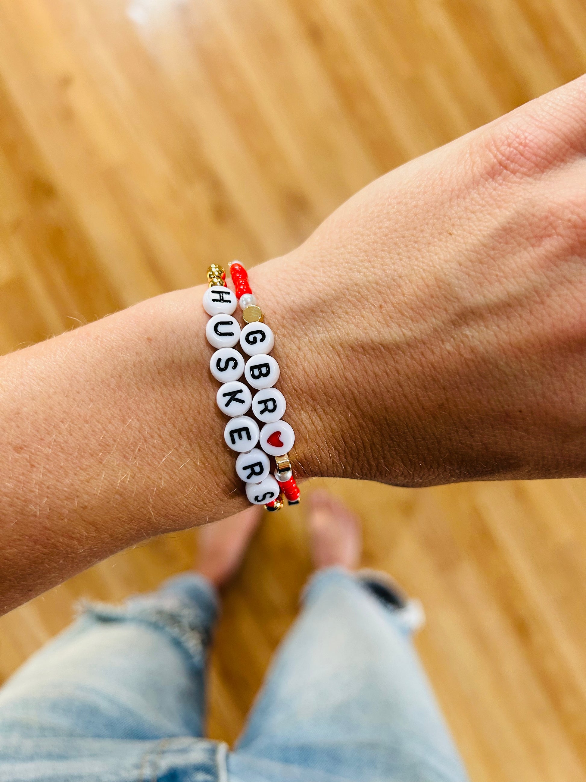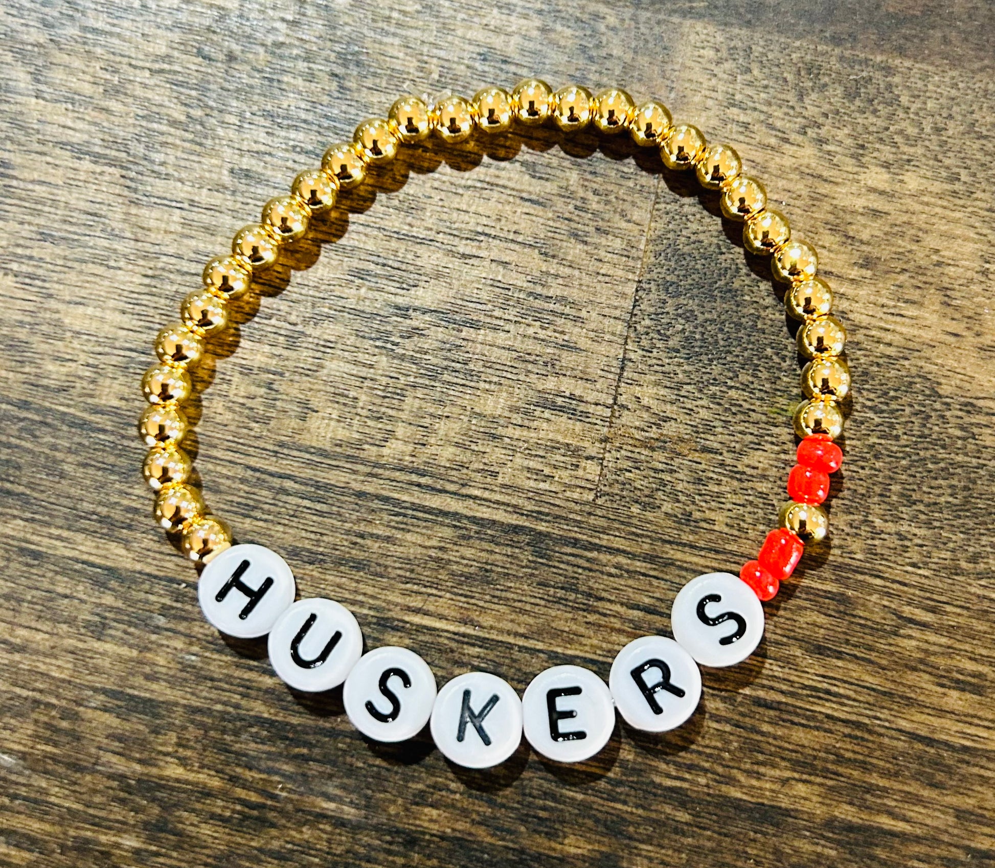 This adorable gold and glass beaded bracelet is perfect to dress up or down for your any day wear or to a football game!